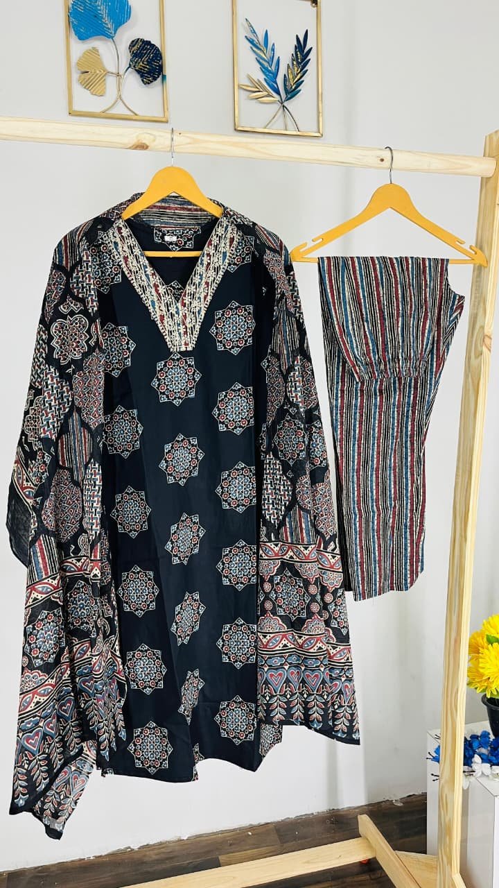 • Printed Kurta: The straight-cut black tunic is adorned with large, symmetrically placed hexagonal mandala motifs in shades of rust, cream, and blue. The V-neckline is highlighted with a contrasting embroidered or printed border.