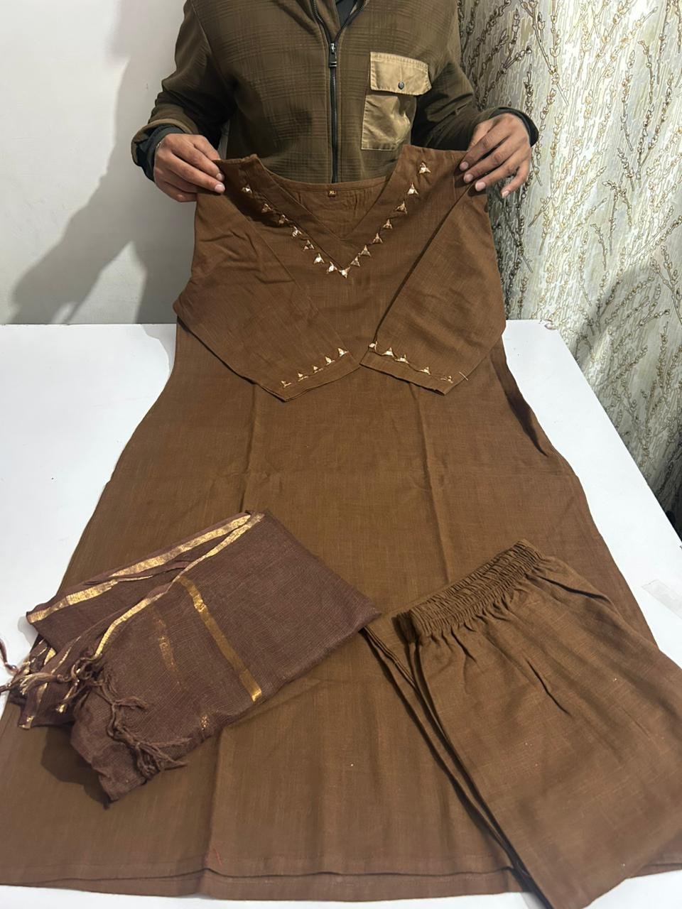 This ensemble is ideal for evening gatherings or formal festivities where a balance of understated luxury and traditional style is desired.