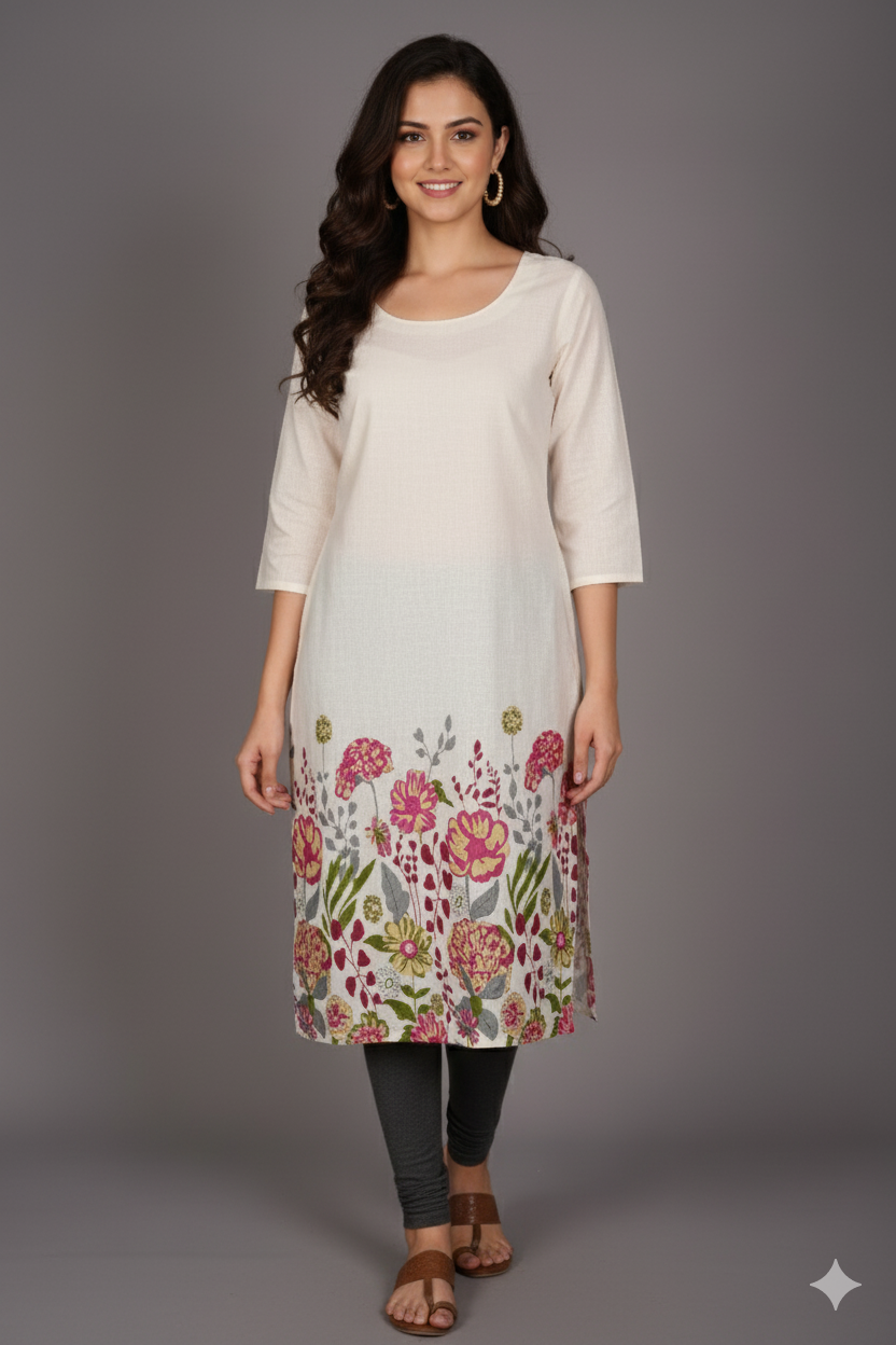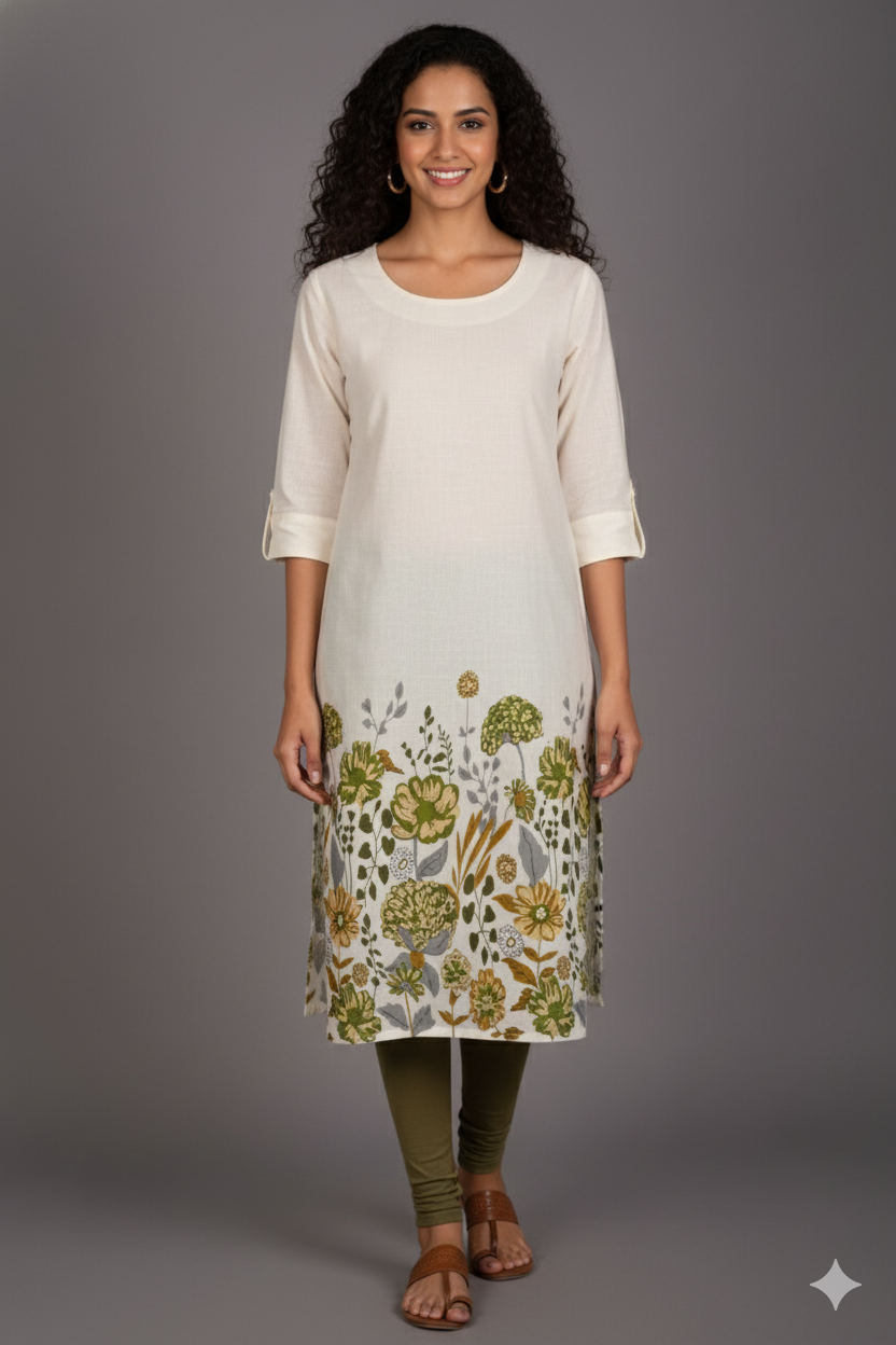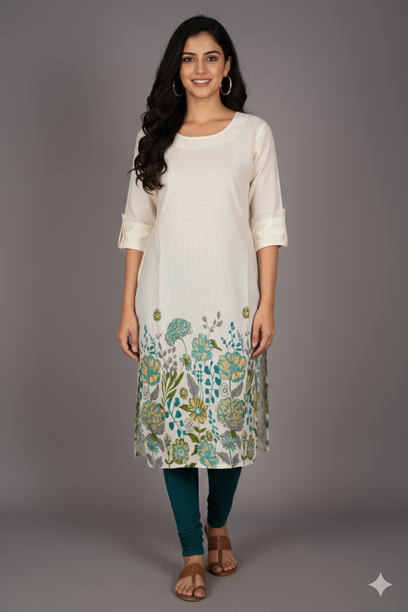 • Design: The key feature is the wide, digital printed floral border that wraps around the bottom half of the garment, starting from roughly the knee area and extending to the hem.