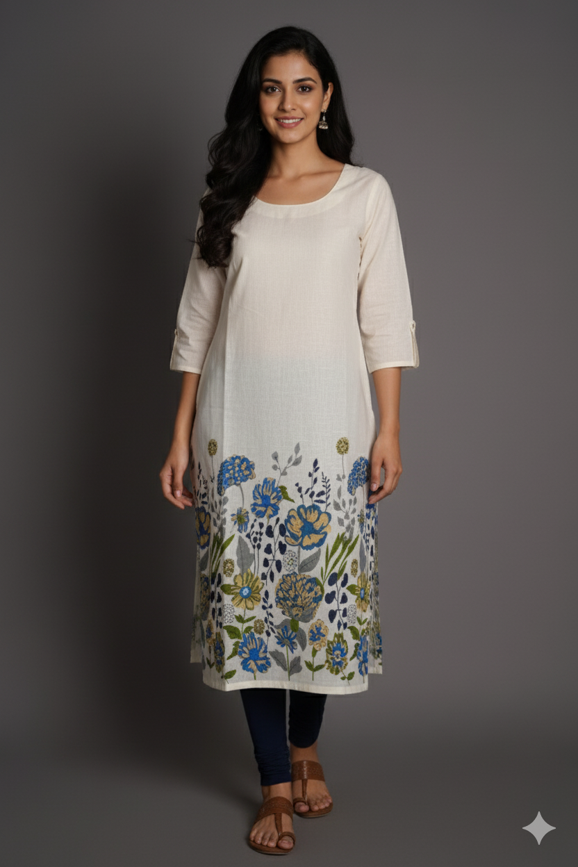• Color: The upper body of the kurta is aĀ off-whiteĀ with a subtle, textured weave, suggesting a natural fabric like cotton or a cotton blend.