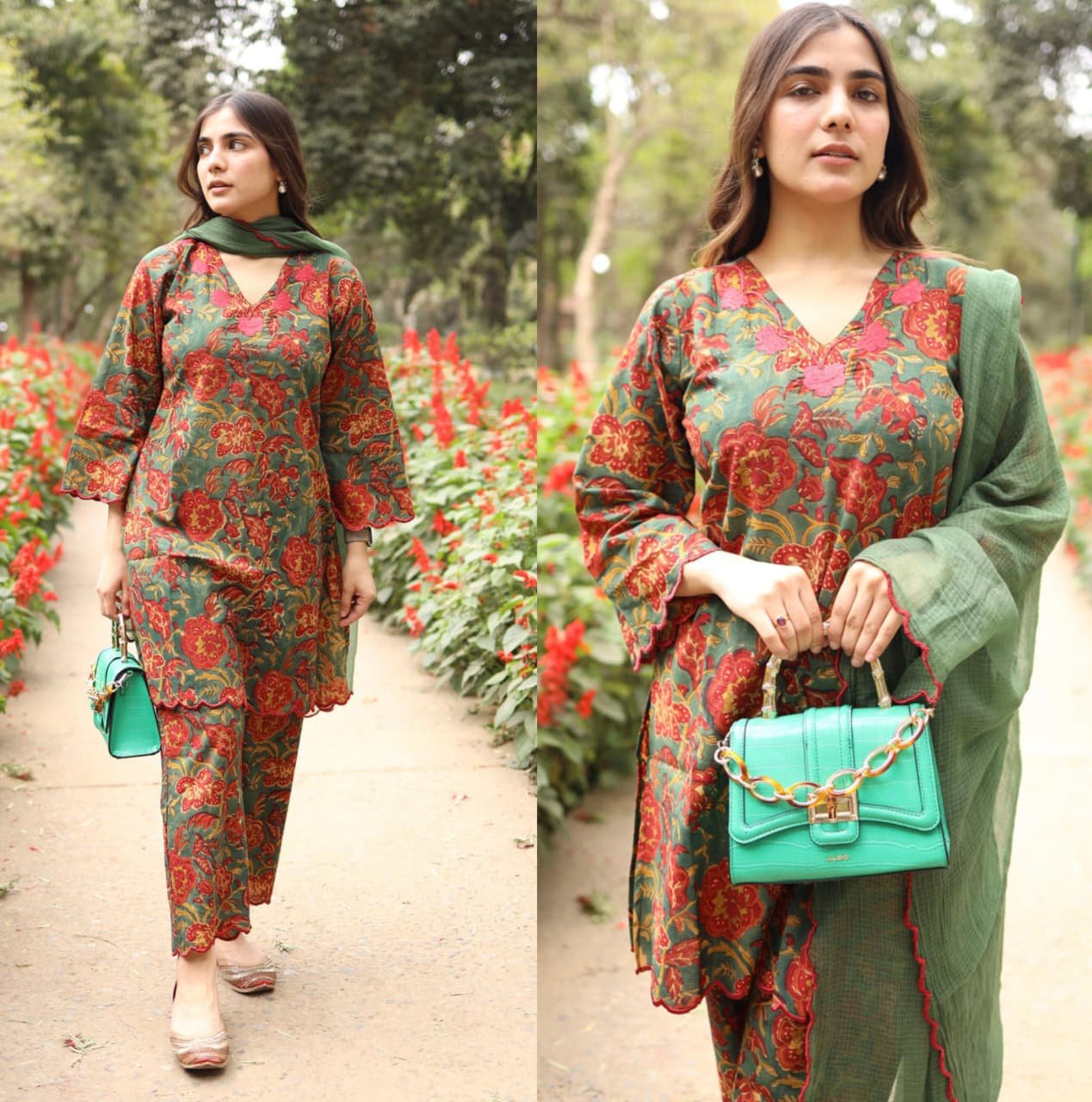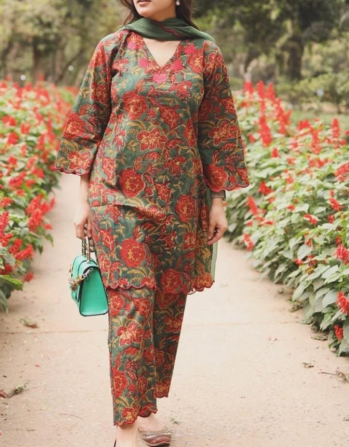 Maria green contrast maroon scallops cordset paired with Kota doria duppatta embroidered scallops on ittop – Cotton