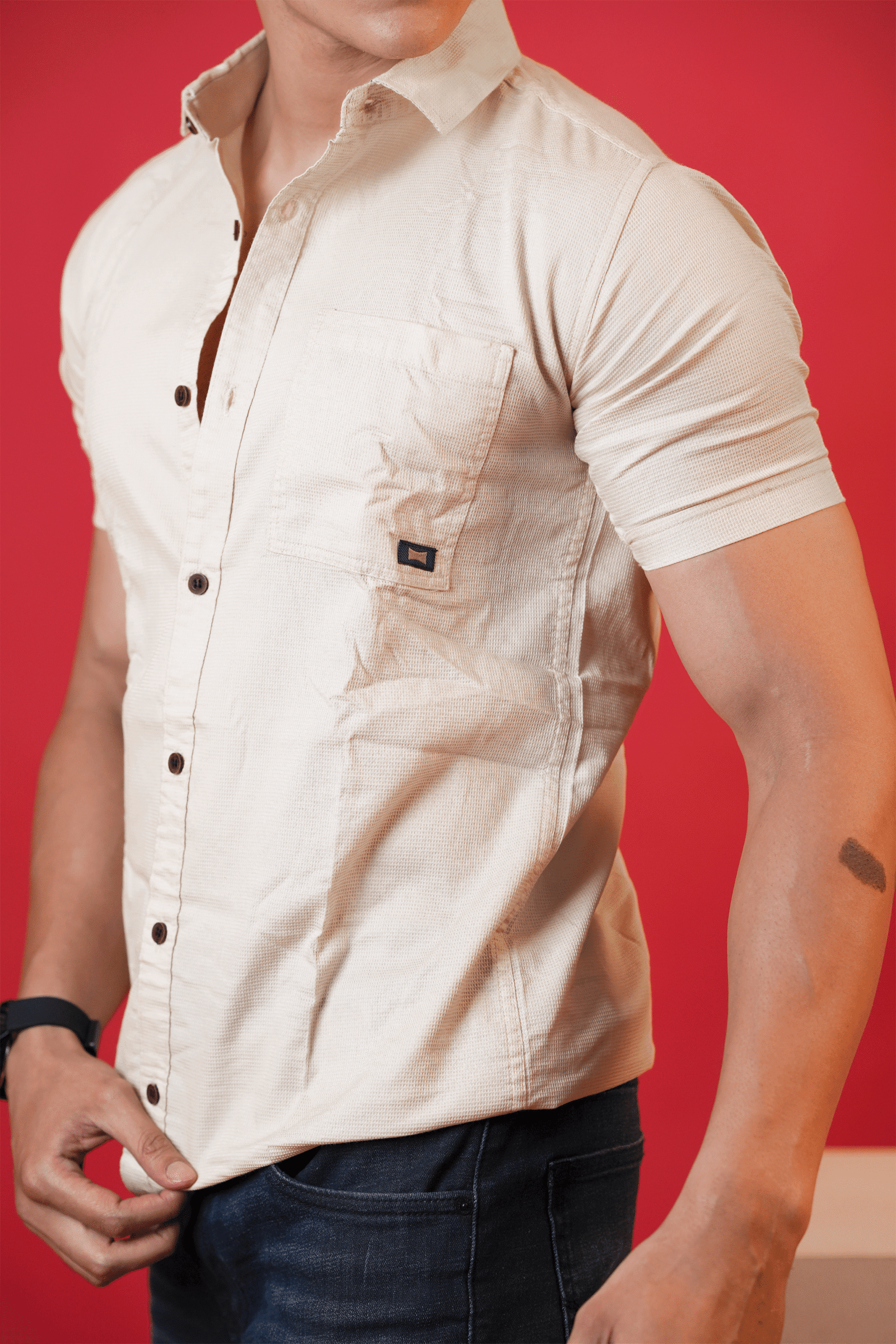 Buttons: Contrasting dark brown buttons run down the front placket, providing a sharp visual break against the light-colored fabric.