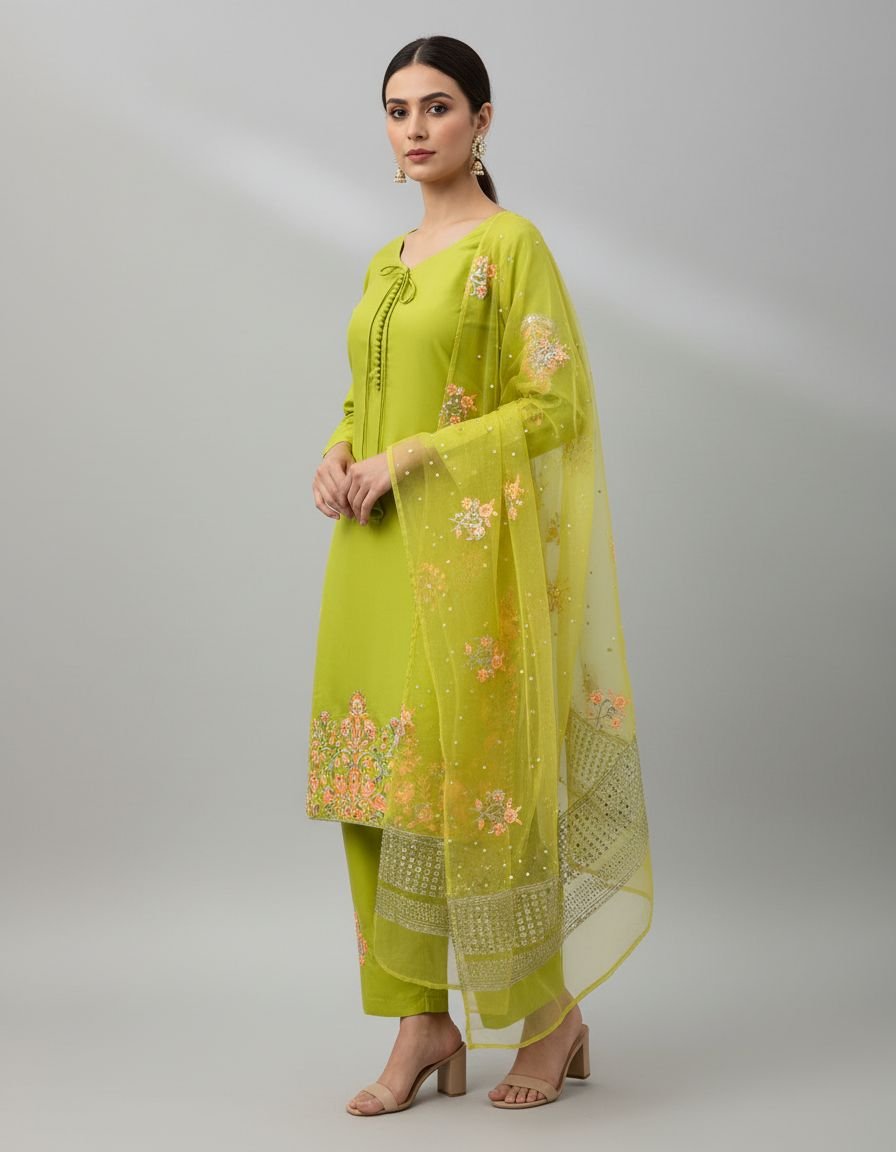 • Bottoms: Paired with matching straight-leg lime green trousers that feature a smaller embroidered floral patch at the hem to coordinate with the kurta.