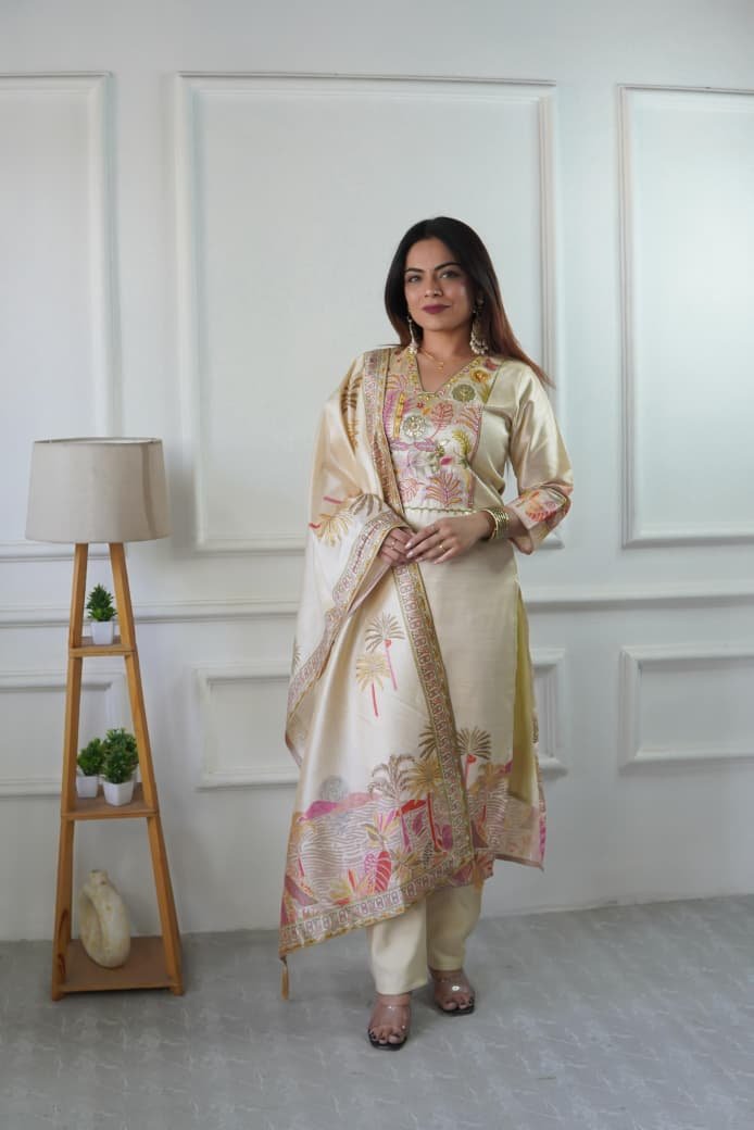 • Embroidered Kurta: This straight-cut tunic features a classic V-neckline and is crafted from a fabric with a subtle horizontal texture, likely a silk or linen blend. The yoke and hemline are adorned with vibrant tropical-themed embroidery, featuring palm trees and stylized landscapes in shades of pink, yellow, and green.