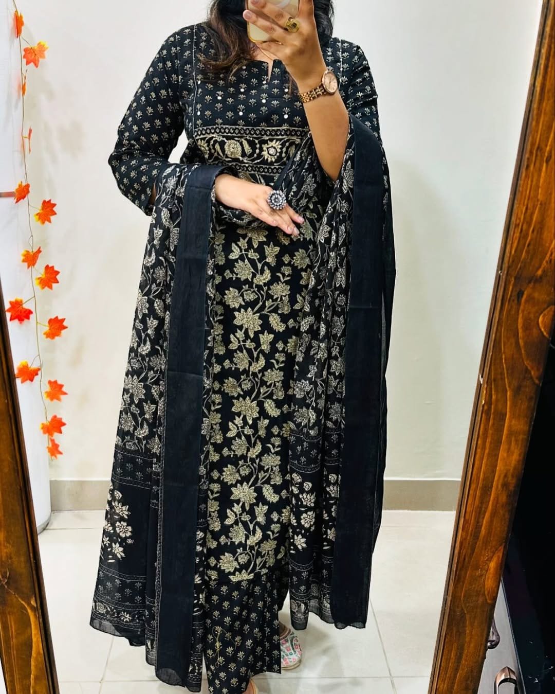 Crafted from a smooth, structured fabric like premium cottonĀ the outfit offers a refined silhouette. It is styled with clear-strap block heels and minimal jewelry, allowing the vibrant contrast of the embroidery against the deep black base to remain the focal point.