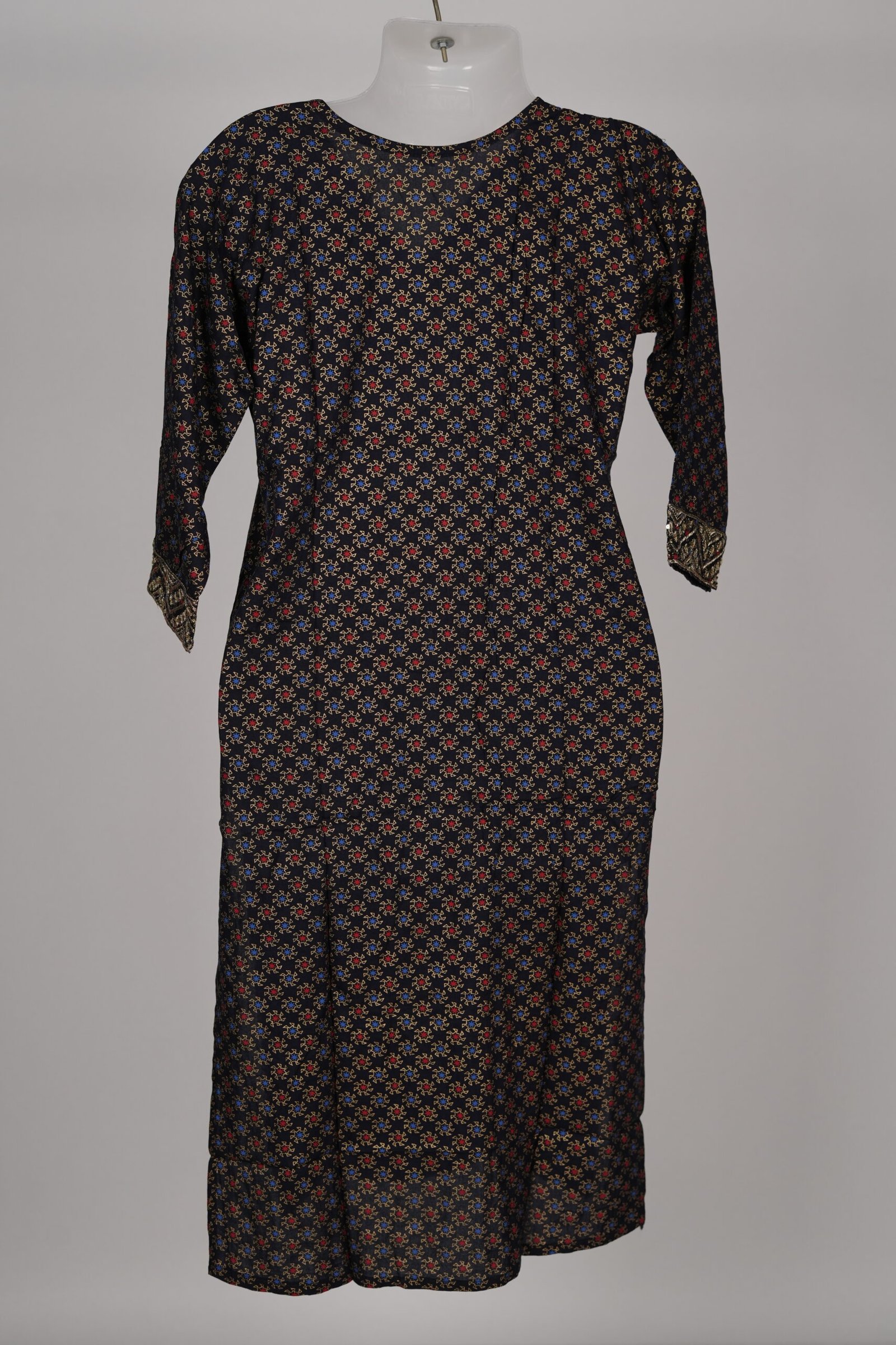 • Sleeves: The sleeves are three-quarter length and match the main body print. There is a simple decorative border or piping on the cuff, likely coordinating with the gold embellishment on the neckline.