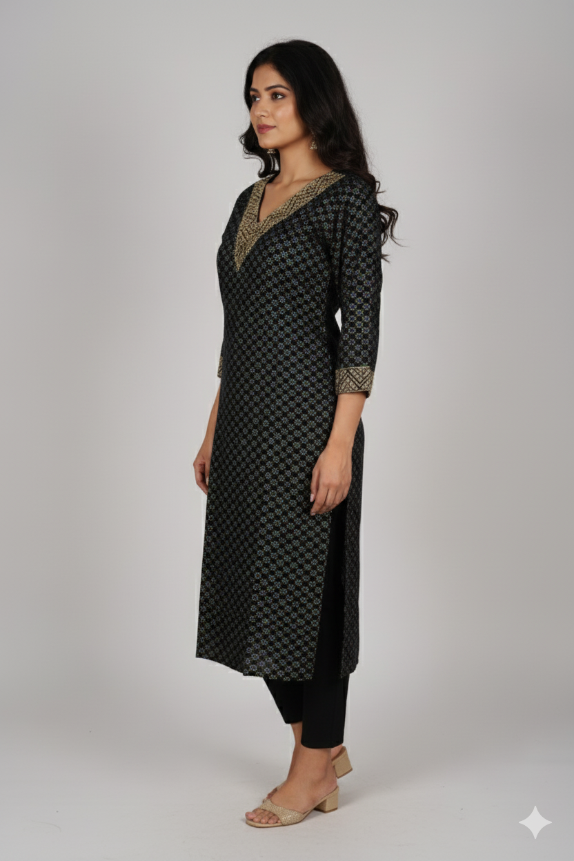 • Color: The main color of the Kurti appears to be a deep shade, likely black