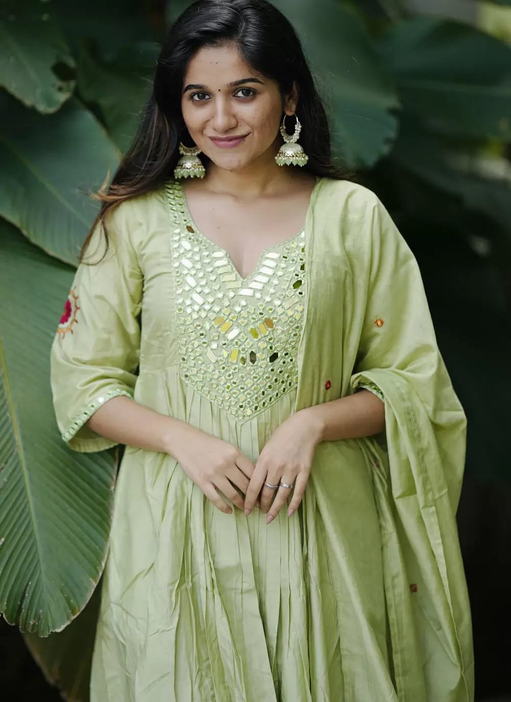 Kurta: A voluminous Anarkali-style kurta in a soft shade. The bodice is the focal point, featuring a deep V-neckline heavily embellished with intricate geometric mirror-work.
